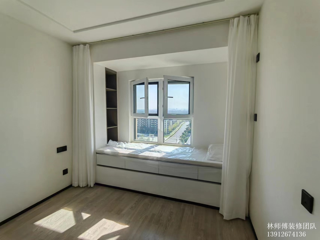 主卧飘窗,白色的沙曼,浪漫唯美。飘窗上做了软垫和书架,马上冬日了,沏一壶茶,坐在上面看看书,晒晒太阳,也是极好的。