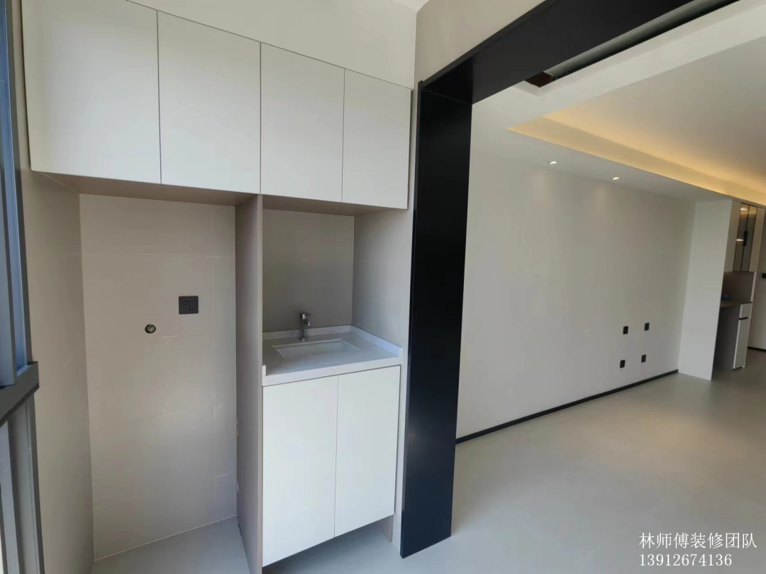 阳台柜,顶部吊柜,增加收纳,底下空出了洗烘机的空间,整体和谐,非常实用。