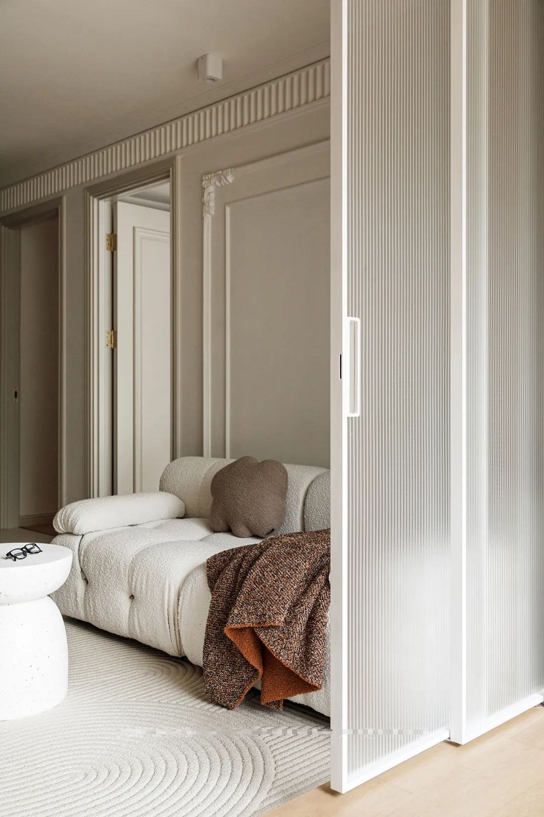 客厅增加了一间房,却没有拥挤的感觉。软装上,客厅的沙发、圆形小茶几都选用体量轻盈的乳白色。电视柜是细腿的,地台是悬挑的,让整个空间有了呼吸感。