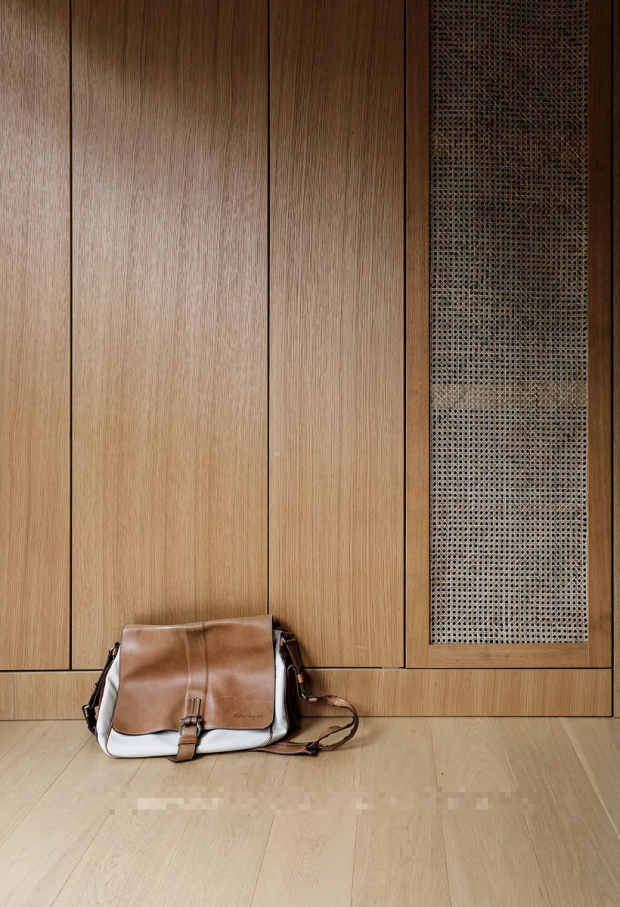 玄关区顺着墙做了整排组合收纳柜,回家放包包、挂衣服、脱鞋一气呵成。