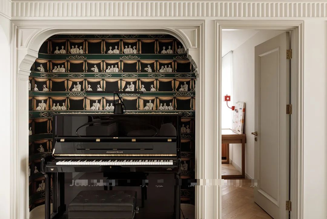 太太的钢琴角,用奶白色古典门套围合,墙面满贴墨绿色歌剧院壁纸,让这个小角落有了丰富的层次感。