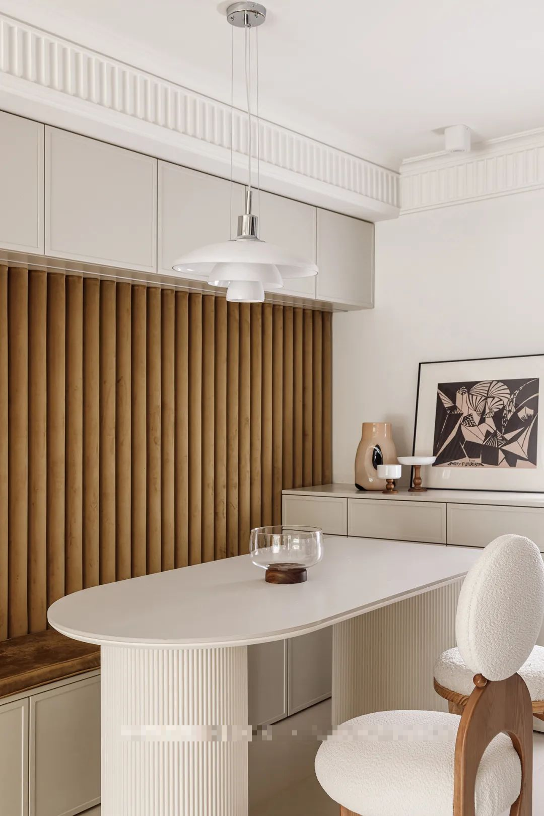 餐厅偏窄长,在靠墙一侧做了整排的丝绒卡座,相比单椅,卡座能坐更多人,也更省空间。