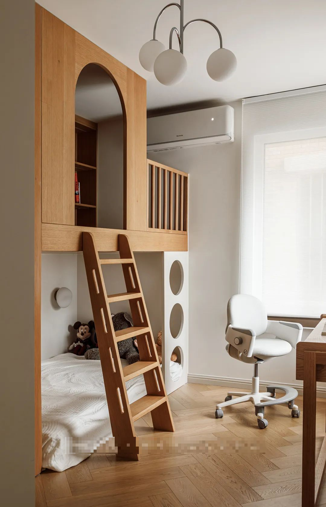 宝宝的上下床以白色和木色区分,上铺的木头拱门和栏杆,太有“树屋”的味道了,还巧妙的化解了上铺空气不流通的问题~
