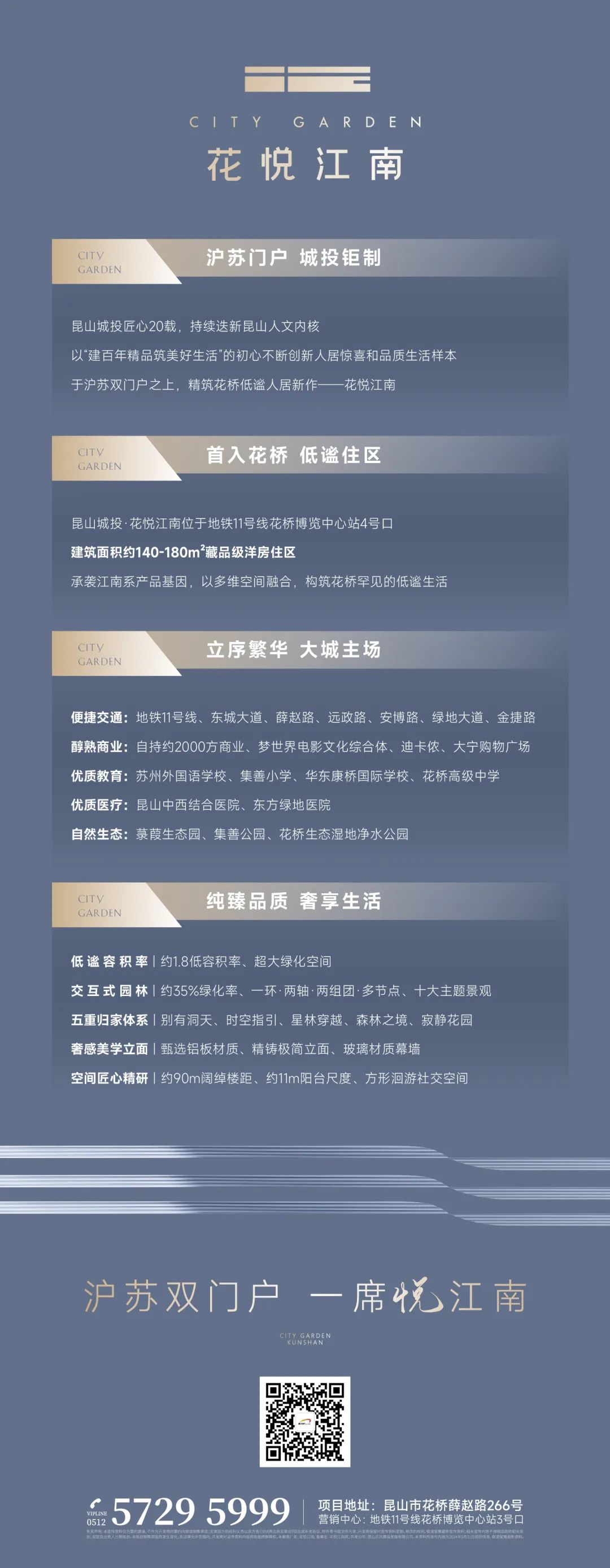 本宣传资料所载内容仅作为活动邀请使用,具体活动内容以现场执行为准。不构成对我司具有约束力的最终承诺。部分内容及图片来源于网络,若有侵权请联系我们删除。本宣传资料为邀约邀请,不作为邀约或承诺,买卖双方的权利义务以《商品房买卖合同》及其协议附件约定为准。本项目备案名为花悦江南苑;推广名为花悦江南 ;开发公司:昆山城市建设投资发展集团有限公司。资料制作时间为2024年5月23日,有效期4天。本公司保留对本资料内容进行修改的权利,敬请留意最新资料。