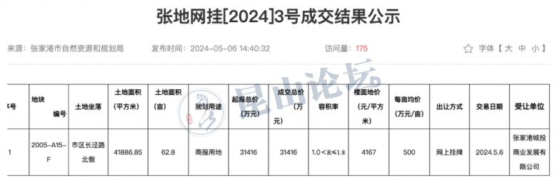 5月6日,张家港市自然资源和规划局公示了编号2005-A15-F地块的成交结果,最终被张家港城投商业发展有限公司拿下,就是张家港山姆的选址处。