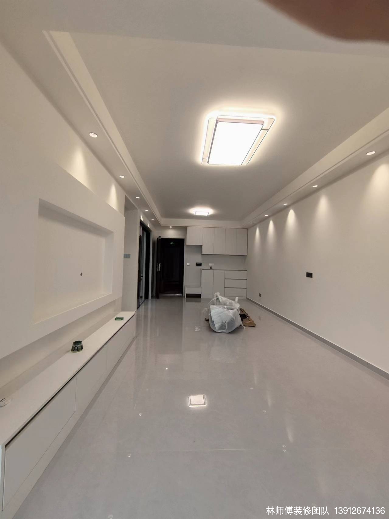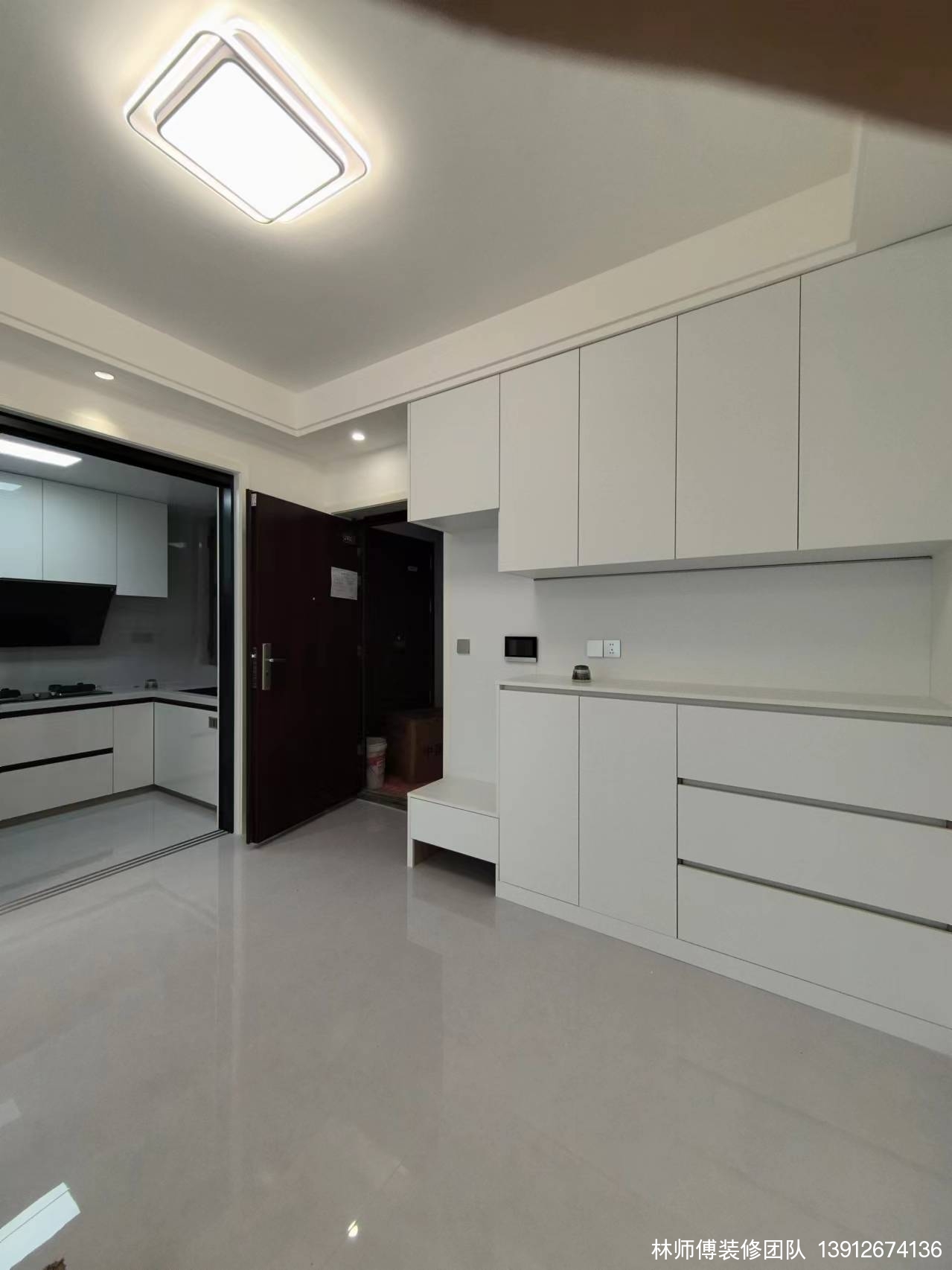 一进门就被这干净明亮的屋子吸引了。白色为主的装修,让空间显得更加宽敞。进门处,一排整齐的橱柜,大大增加了家里的收纳空间。靠近门口的地方,是一个换鞋区,底部镂空,换好的鞋子直接收拾在这里,保持门口处的整洁。