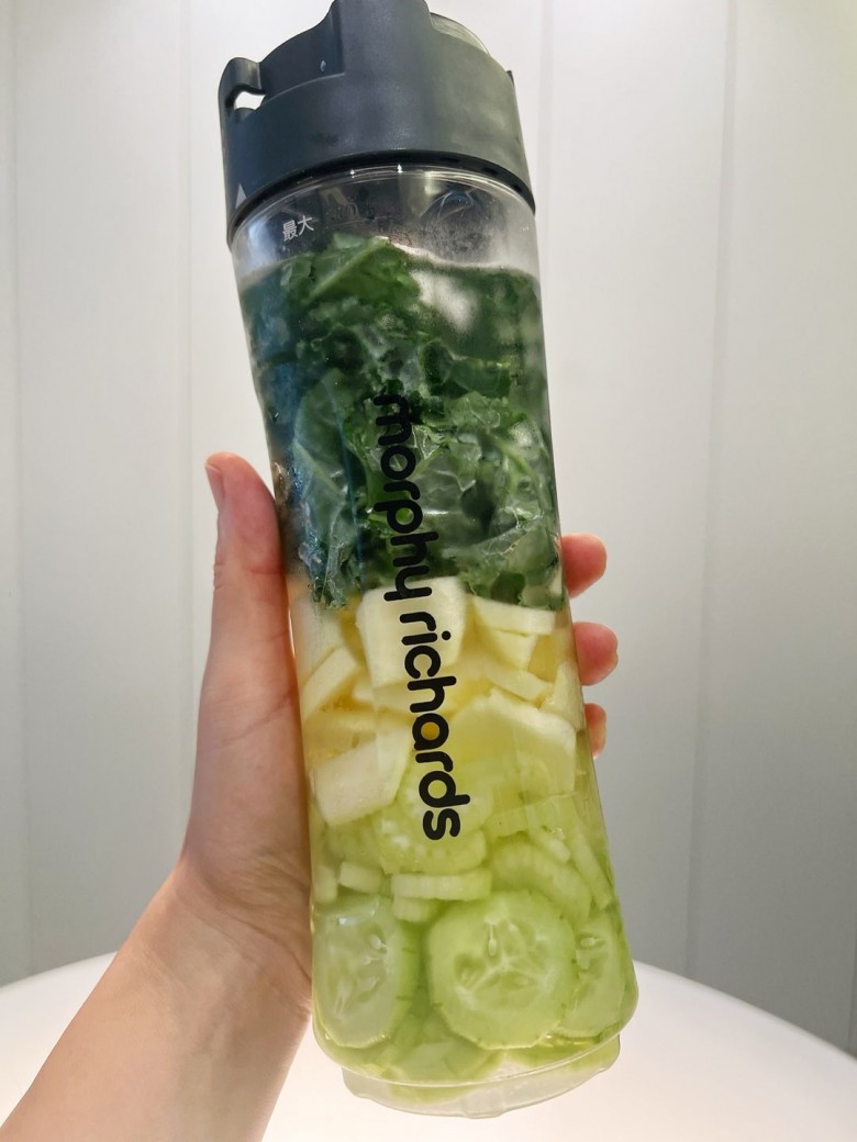 oginochihiro: 嗯呢,羽衣甘蓝、西芹、黄瓜、苹果和椰子水一起榨的,过滤一下加冰块喝着很清爽。