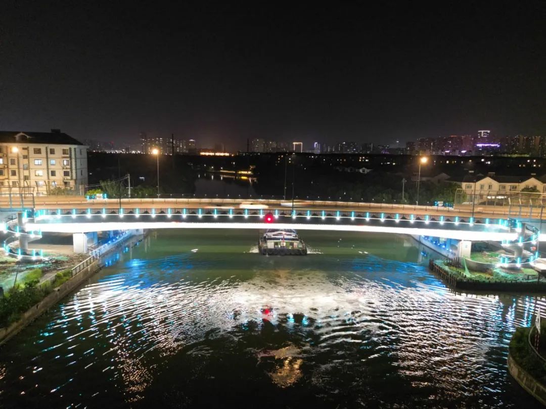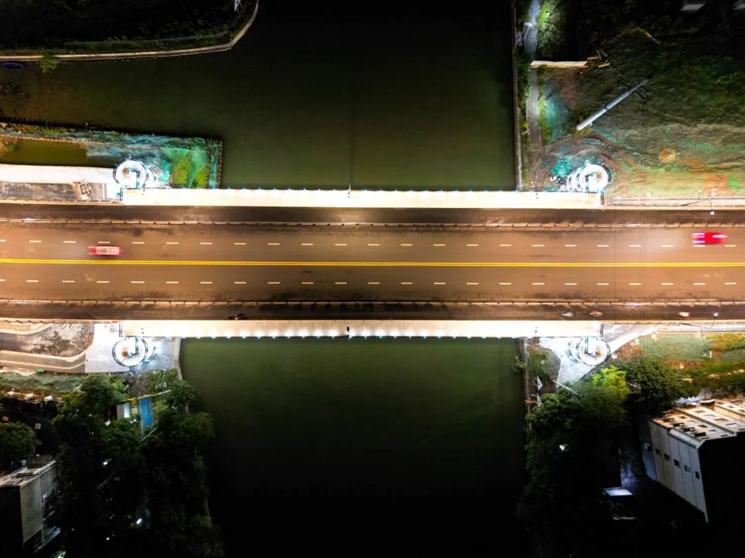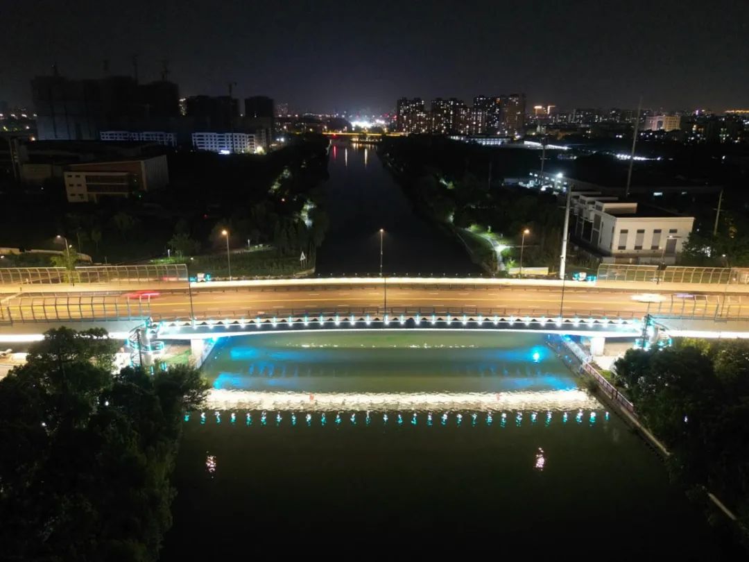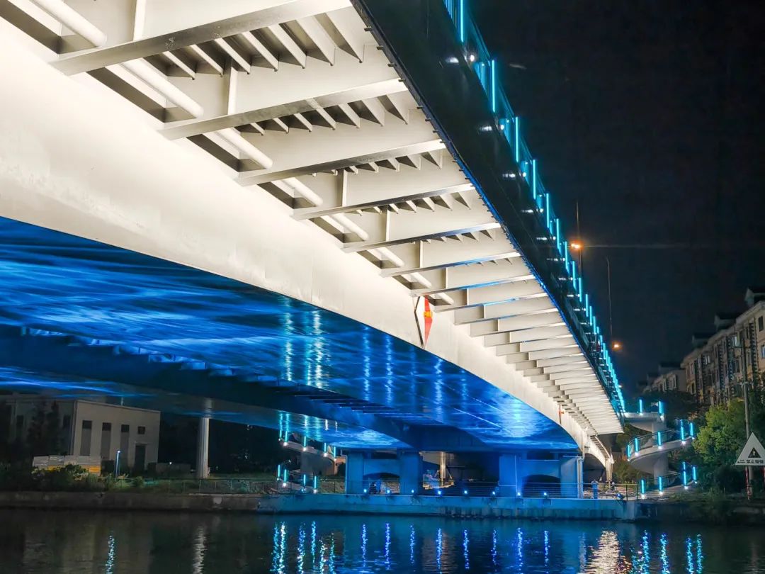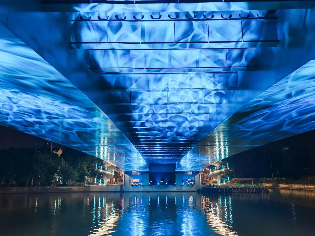 两岸各设置两个旋转楼梯,楼梯的栏杆立柱装有162套湖蓝色线条灯和196套投光灯,桥下安装20套水纹图案灯,投射在桥腹板上展现水波粼粼的画面,营造“夜空有星光,桥上有灯光,河中有波光”的夜间照明氛围。