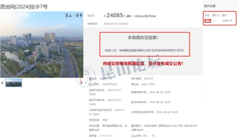 本案为住宅用地,出让面积21995㎡,苏州耀荣置业有限公司底价竞得,成交总价24085万元,成交楼面价8423元/㎡,本场土拍无溢价。