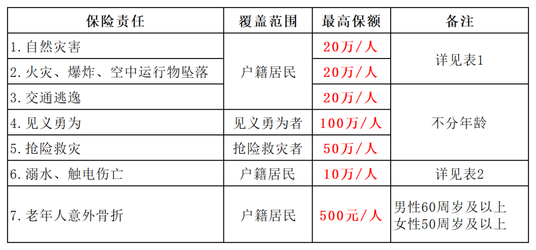 1.对民政界定的五类困难人群因自然灾害、火灾、爆炸、空中运行物体坠落、溺水、触电等事故造成的人身伤亡保障额度上浮20%