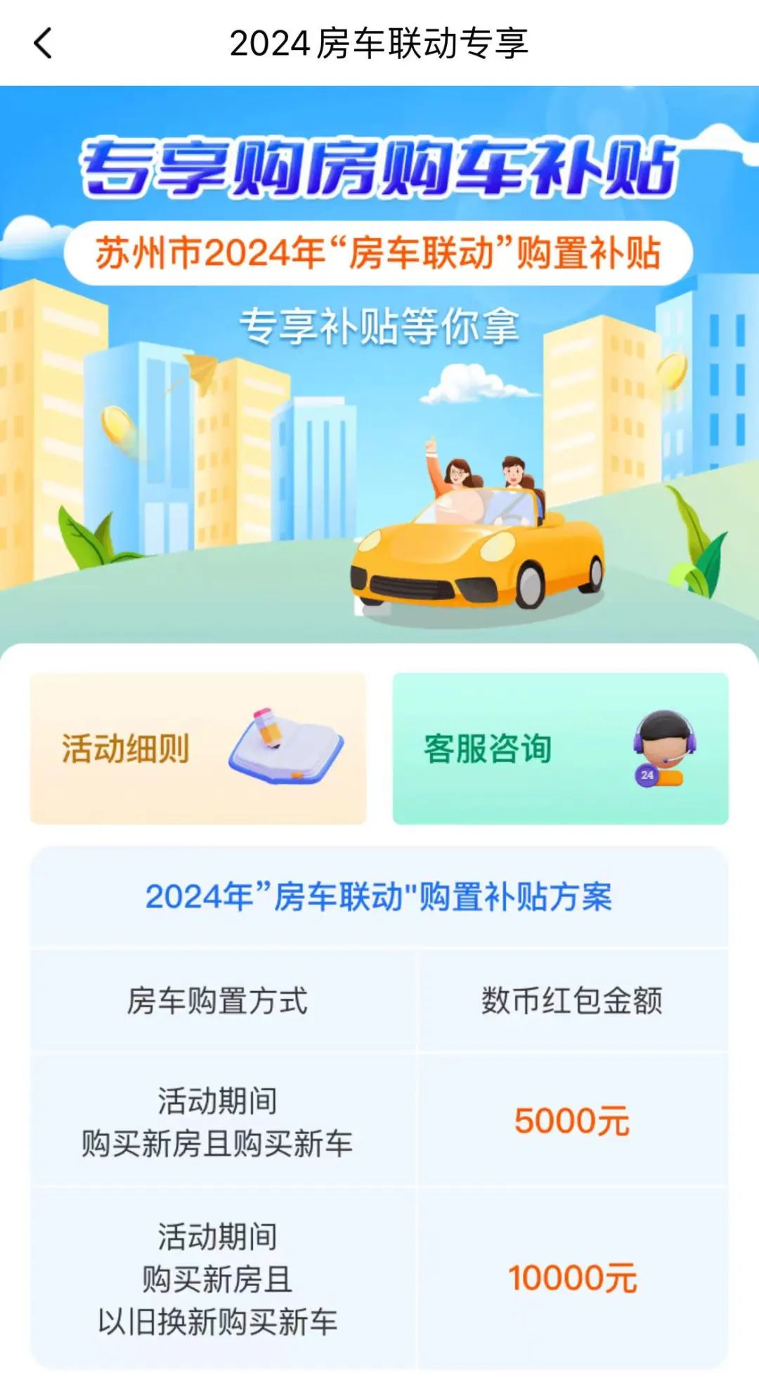 在苏州市参与活动的房地产开发企业和汽车经销企业处既购房又购车的个人消费者。购买房屋为新建商品住房(购置时间以住建部门商品房网签合同备案时间为准,不包括人才房、安置性商品房等政策性住房),购买汽车为乘用车新车(购置时间以机动车销售统一发票时间为准,乘用车是指在公安交管部门注册登记的小型、微型载客汽车)。