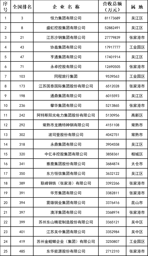 榜单显示,苏州共有25家企业入围“2024中国民营企业500强”,22家企业入围“2024中国制造业民营企业500强”,上榜企业数双双位居全省第一。同时,有2家苏州企业入围“2024中国服务业民营企业100强”。其中,恒力集团有限公司连续三年位居制造业民营企业500强首位。