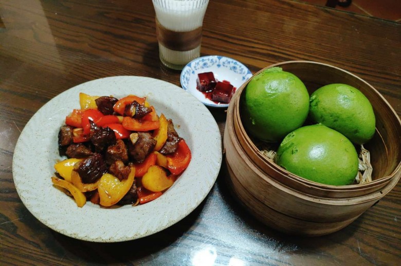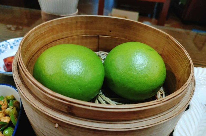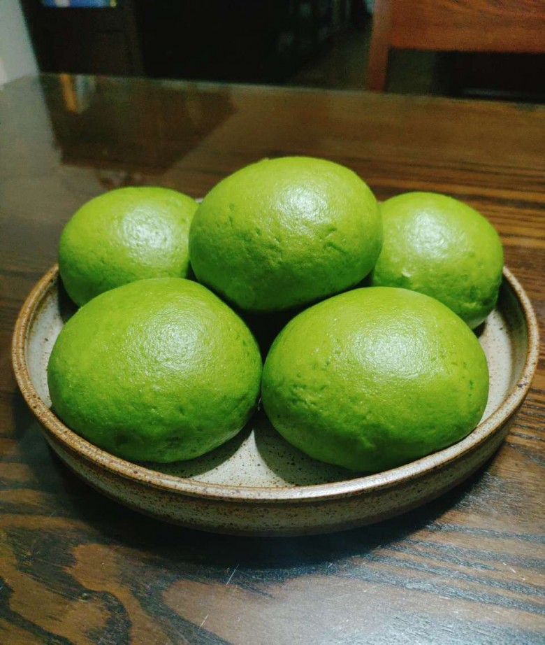 菠菜汁揉面,怕会发黄,没想到成品还可以。早餐搭配下颜色还蛮好看。
