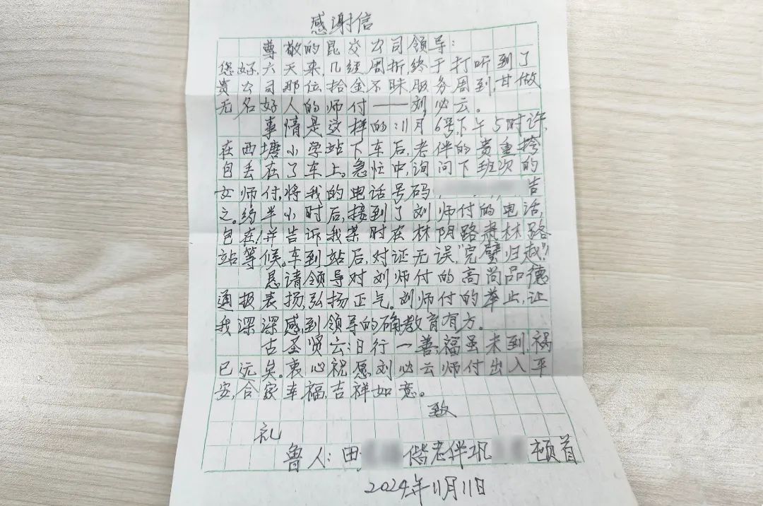11月6日,公交35路驾驶员刘必云在车厢内发现了一个黑色皮挎包,内有个人证件、医保卡、现金与手机等贵重物品。刘师傅及时报备管理人员并上交挎包。失主在下车后发现挎包遗落在车内,便在站台等待下一辆35路公交,并告知当班驾驶员相关情况。经由同事转告后,刘师傅立刻联系失主,约定好时间与地点,将物品亲自交还了乘客。11月11日,乘客为表达感激,特写了一封感谢信表扬了刘师傅拾金不昧的高尚品德。