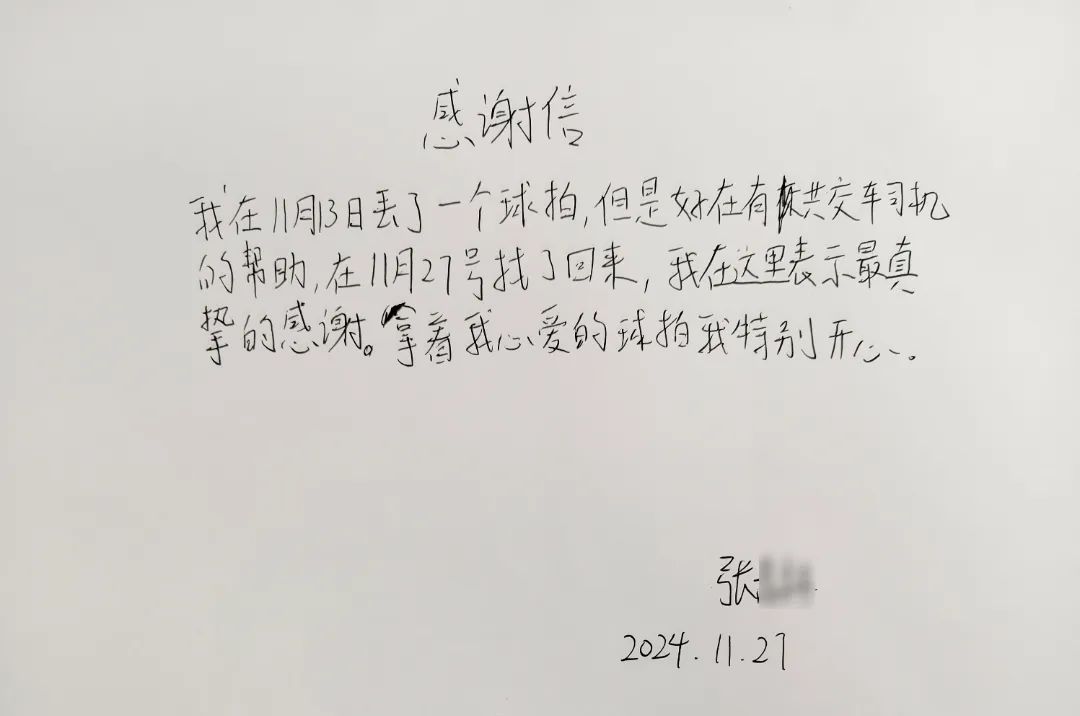 公交32路驾驶员捡到球拍 归还失主获感谢信