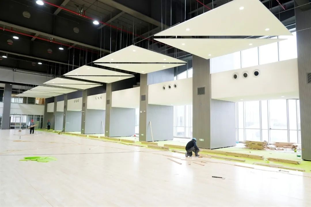 篮球场馆内,工人正在抓紧铺设运动地板,篮球架、看台等软装配套设施也将在交付运营后陆续进场安装。作为昆山旅游度假区的标杆工程、示范工程、样板工程,建设伊始,项目工地始终保持“洁序净美”,先后获评江苏省三星级文明工地和江苏省“云观摩”工地项目,一次次刷新“标杆身份”。
