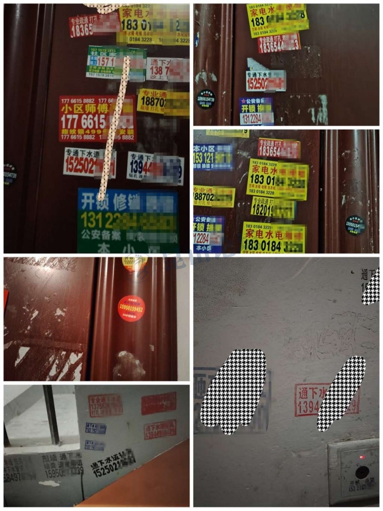 现在贴 小广告的嚣张的不得了,贴得大门和楼道上全是广告,大门快被小广告覆盖完了,业主搞卫生很头痛,胶粘在门上又不好撕,费力撕干净了,过几天,又贴得满满的,实在忍无可忍,打电话给小广告的,让他不要贴了,不好搞干净,这小广告嚣张的很呢,说就贴了咋么的,他就要贴。。。。。。。。。我真是火大。。。 然后奇葩来了,之后,JIAN人把我的手机号码贴得裕花园小区都是的,还污言秽语的,立马报警立案,让警察收拾这个死人。警察打电话让他去抹掉,他还狡辩甩锅是同行贴的,真的是搞笑,敢做不敢当,还让同行背你的黑锅,品德败坏的**垃圾东西。