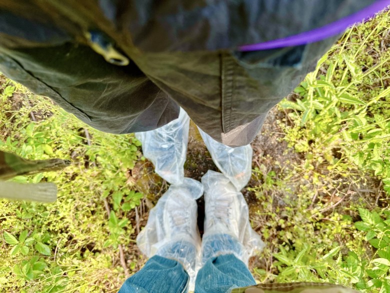 带了之前买的下雨天一次性防雨鞋套,对于一早林子里的露珠,穿这太实用了。