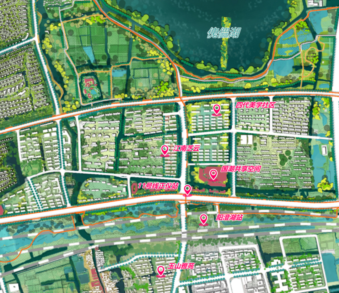 ▶ 傀儡湖南岸艺术社区地块占地70亩,规划为居住、商业用地,距离轨道交通正仪站仅500米,容积率不高于1.5的规划指标,既可营造低密滨水住区,又能通过配建商业设施激活站城一体化开发。