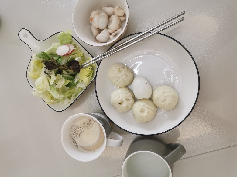 今早小笼包鸡蛋蔬菜山竹+咖啡一杯