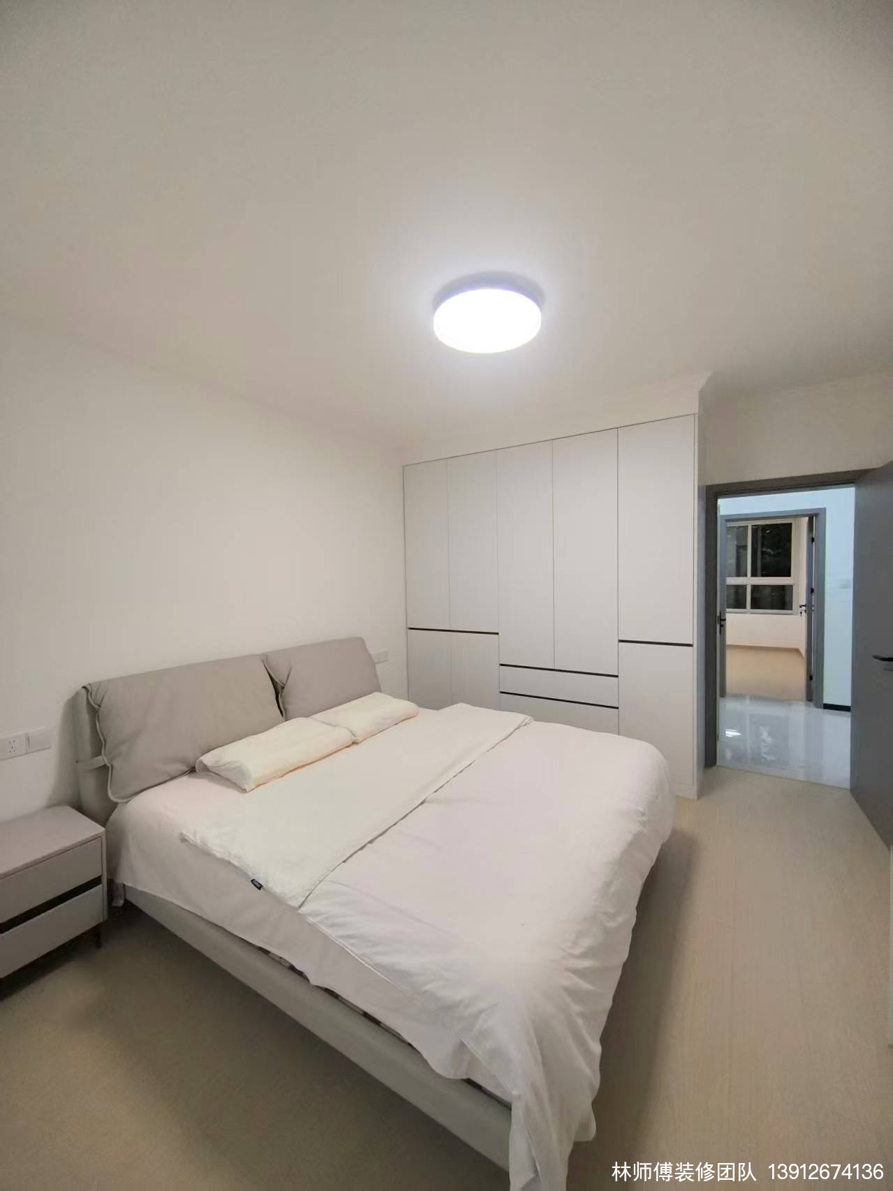 主卧以灰色 + 白色为主色调,衣柜做了通顶设计,内部划分出挂衣区、叠放区、抽屉区,四季衣物都能妥善收纳,整体氛围温馨又舒适。