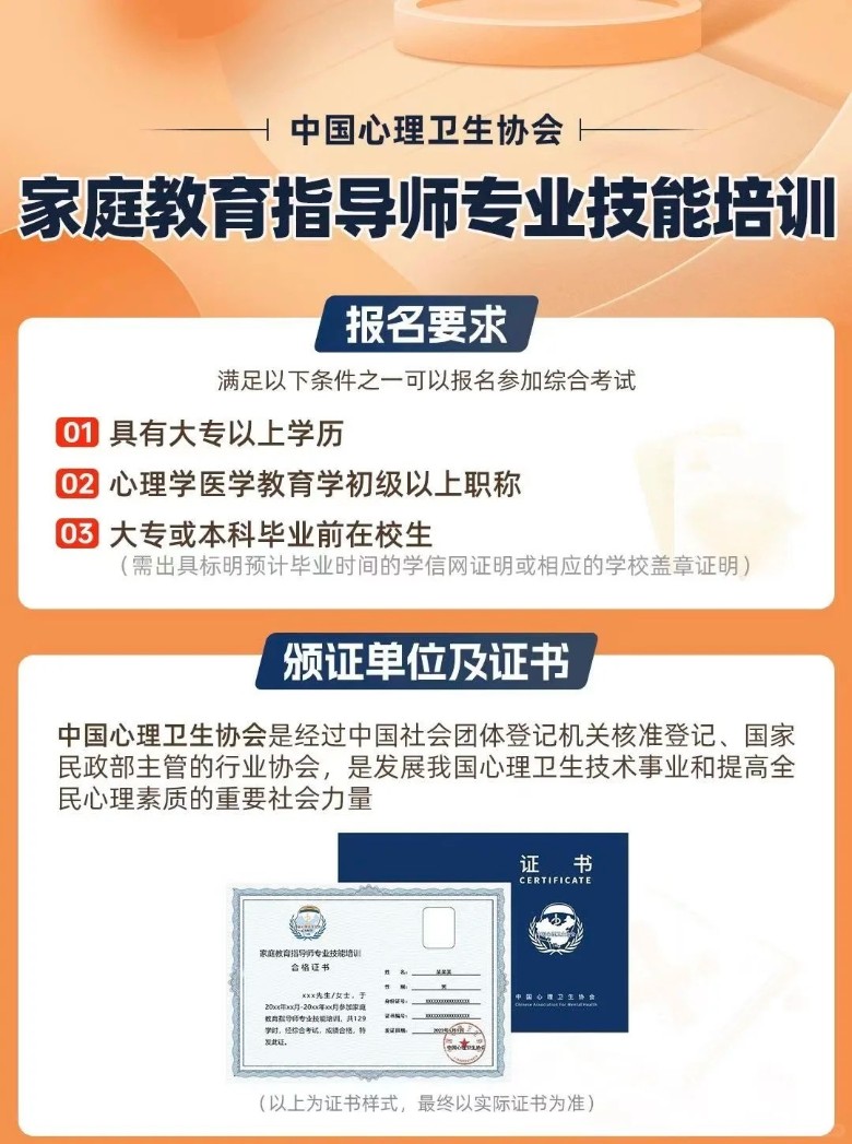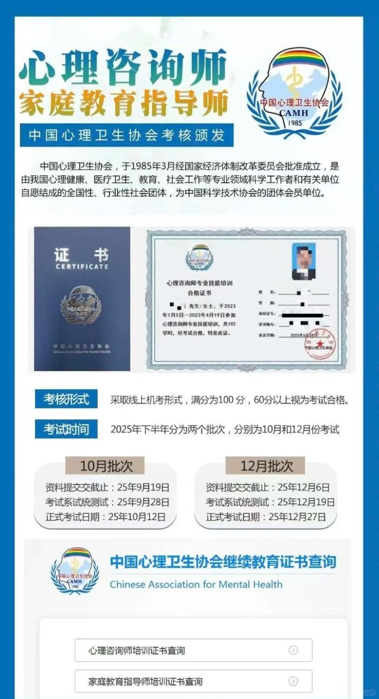 证书颁发:由中国心理卫生协会颁发,统一编号,在项目网站可进行查询 。