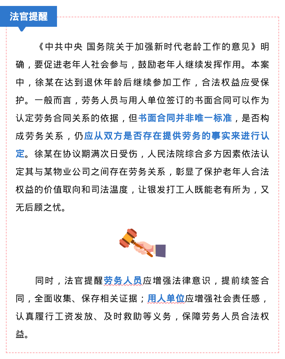 2023年7月1日,徐某在达到退休年龄后,受某物业公司雇佣为某小区提供保洁服务,双方劳务协议约定协议期至2024年6月29日。2024年6月30日下午,徐某手提塑料袋经过某小区楼下步梯旁的斜坡时摔倒受伤致十级伤残。某物业公司以双方劳务合同期限届满,徐某并非在为其提供劳务过程中受伤为由拒绝赔偿。徐某遂诉至重庆市城口县人民法院,要求某物业公司赔偿其医疗费、误工费等各项费用共计11.6万元。