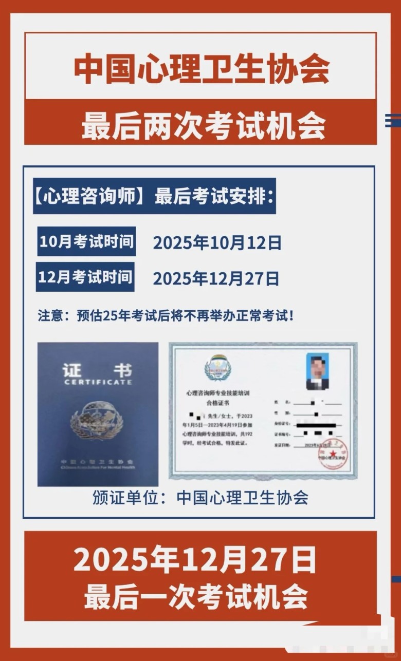 《2025年心理咨询师报考中心》心理咨询师报考条件:年龄要求,学历要求,专业要求;2025年报考新要求已出及本期报名即将截止,请尽早报名准备,以免错过考试...你可能还想知道:报考条件📝 考试与认证流程考试时间:2025年有多个考试时间点,今年的最后一次考试日期是12月27日 。考试形式:线上笔试考试,满分100分,60分及以上及格。证书颁发:由中国心理卫生协会颁发,统一编号,在项目网站可进行查询 。报考条件:年满18周岁,具有中华人民共和国居民身份证,并符合以下条件之一:大专及以上学历、心理学、医学、教育学初级以上职称、在校学生(需出具学信网证明或学校盖章证明)。📝 职业前景与自我成长心理咨询师是备受尊敬且需求持续增长的职业,工作形式灵活(可全职、兼职、线上/线下),职业发展路径多样(个体执业、机构任职、企业EAP、学校心理辅导等)。学习心理学知识不仅能助人,更是深刻理解自我、改善人际关系、提升情商和幸福感的宝贵财富 。🔸2025年心理咨询师考试时间★每年有3-4次考试,目前可报5月/7月/12月考期(09:30-11:30考试)今年最后一批考试在12月27日,现在正在报考期。.🔹上课设备:手机/平板/电脑,均可学习❗🔹授课方式:线上录播视频课程,随听随学、无地域时间限制,随时可学习❗.以上便是关于心理咨询师考证内容,如有疑问,可询问哦!