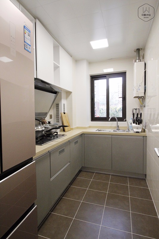 厨房部分,保留了精装房原有的设计,业主的厨房电器、用品、冰箱添置进去,这才是家该有的样子。