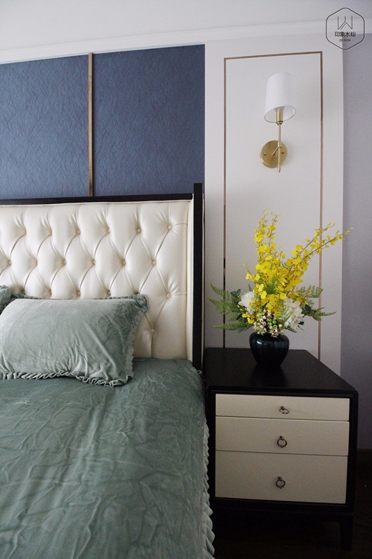主卧床头背景的设计,与客厅沙发背景的设计不谋而合,米色与深蓝色的床头背景,结合米色的双人床、白色的衣柜、咖色的窗帘,为主卧奠定了一种轻奢温馨的基调,浅绿色的床品,更是显得优雅大方。