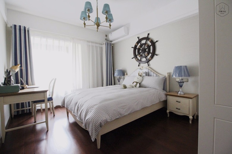 儿子的房间,色调轻盈,清爽不造作。整个空间以浅绿色、蓝色、白色三种颜色为主色调,整体感受通透清新。为了营造一个舒适的学及睡眠环境,在床的斜对面设计了书柜,方便儿子放学回来的功课复。