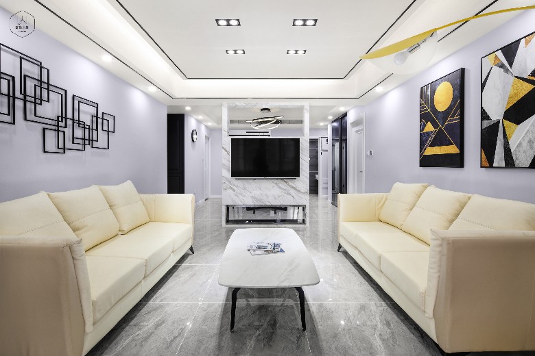 客厅选用简洁的淡紫色作为主色调,即为业主最爱的颜色,加之米黄色沙发,软装艺术壁画的点缀将业主的想法更深刻的融入整个空间,白色纱帘保留客厅通透的优势,整个空间更显清爽干净。