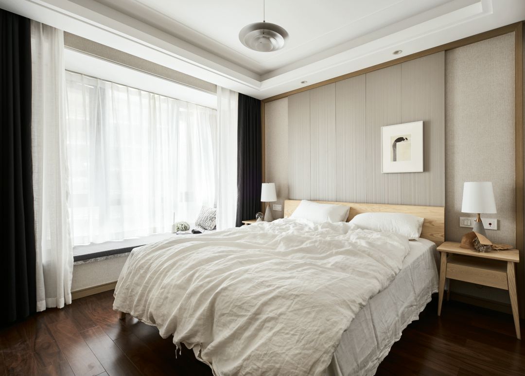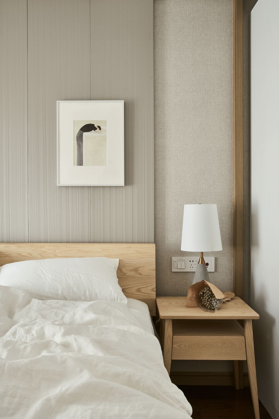 根据简约的硬装基础,设计师选择了日式亚麻的床品,点睛的挂画,从简单朴实中捕捉美感。