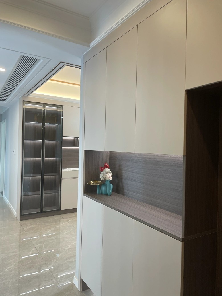 背景墙选择深灰肤感木饰面➕哑光岩板,电视位选择内嵌。