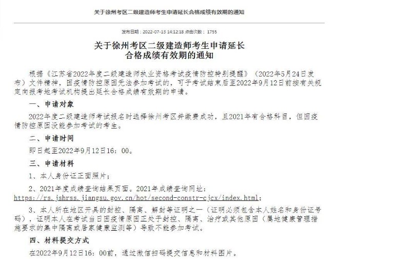 2022年江苏省二级建造师考试已经结束马上就两个月了,考试成绩预计于8月中旬发布,届时肯定又是几家欢喜几家忧,不过这个暂且不提。作为比较特殊的一年里,江苏人可谓经历了太多太多,当然也就有不少二级建造师考生受到影响导致无法参加考试。对此, 不知道大家还记不记得江苏省人事考试中心于5月24日发布了一条“关于江苏省2022年度二级建造师执业资格考试疫情防控特别提醒”,提醒中指出“ 因疫情防控原因无法参加考试的,可于考试结束后至2022年9月12日前按有关规定向报考地考试机构提出延长合格成绩有效期的申请”,今天对于申请二级建造师考试成绩延期终于有消息了。6月14日,泰州人事考试中心率先发布“关于因疫情防控无法参加二建考试考生申请延长合格成绩有效期的通知”,考生因疫情防控无法参加2022年度二级建造师资格考试的,可以开始申请有效成绩延期。详情请登录泰州人事考试网-专业技术人员资格考试专栏。7月11日,南通人事考试中心发布“关于南通考区二级建造师考生申请延长合格成绩有效期的通知”因疫情防控原因无法参加考试的考生可以开始申请二级建造师有效成绩延期。详询可登陆南通人事考试网-通知公告专栏。