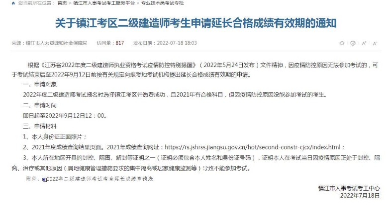 7月18日,镇江人事考试中心发布“关于镇江考区二级建造师考生申请延长合格成绩有效期的通知”,因疫情防控原因无法参加考试的考生可以开始申请二级建造师有效成绩延期。详询可登陆镇江人事考试网人事考试服务平台-专业技术类考试专栏。