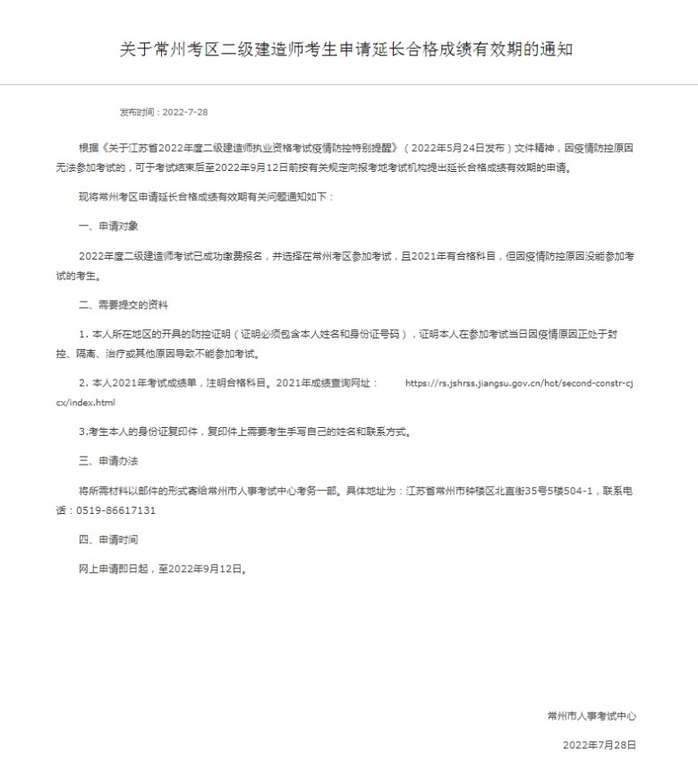 7月13日,徐州人事考试中心发布“关于徐州考区二级建造师考生申请延长合格成绩有效期的通知”,因疫情防控原因无法参加考试的考生可以开始申请二级建造师有效成绩延期。详询可登陆徐州人事考试网-专业技术类考试专栏。7月28日,常州市人事考试中心发布“关于常州考区二级建造师考生申请延长合格成绩有效期的通知”,因疫情防控原因无法参加考试的考生可以开始申请二级建造师有效成绩延期。详询可登陆常州人事考试网-执业、职业资格考试专栏。
