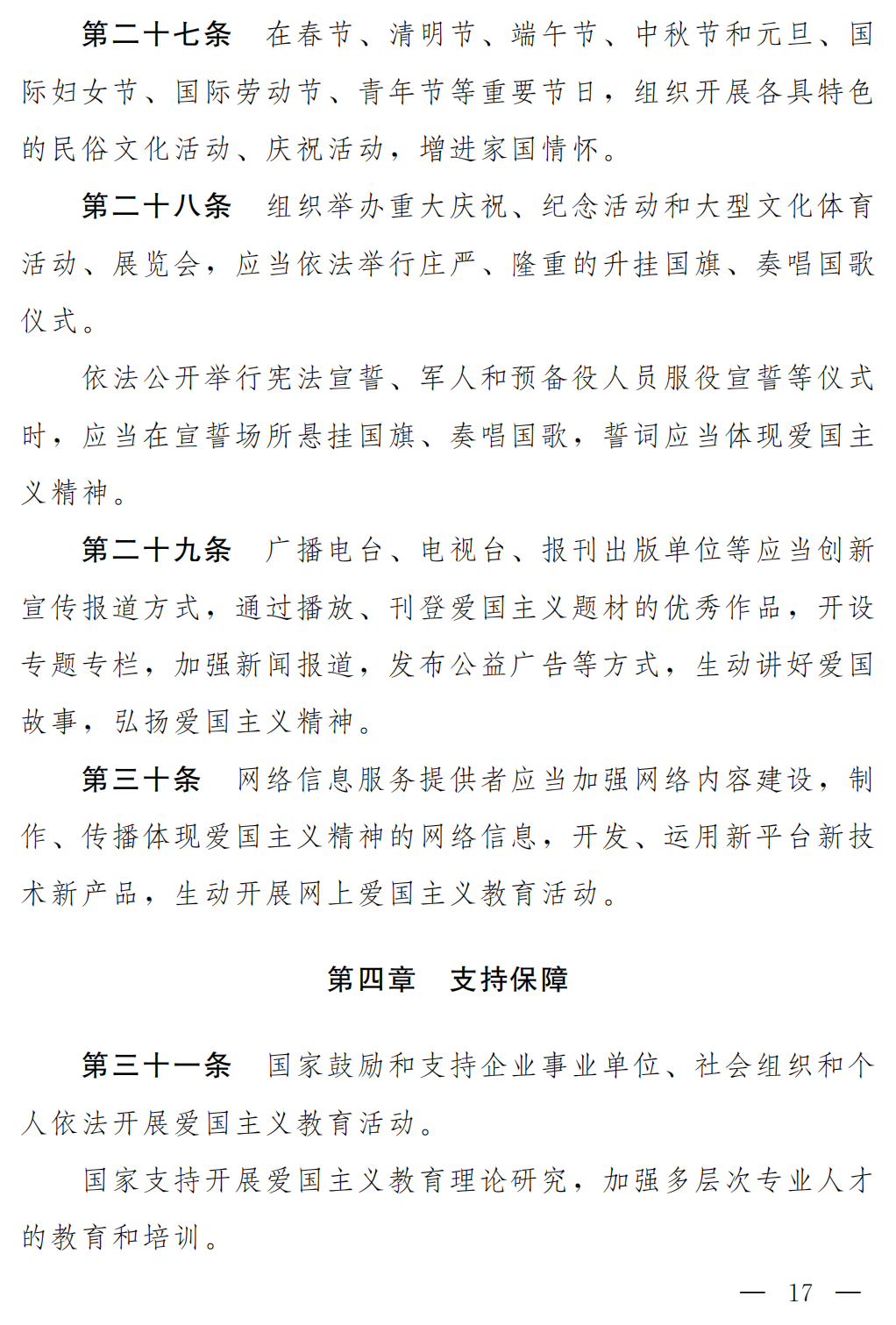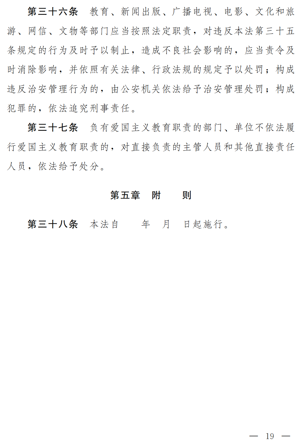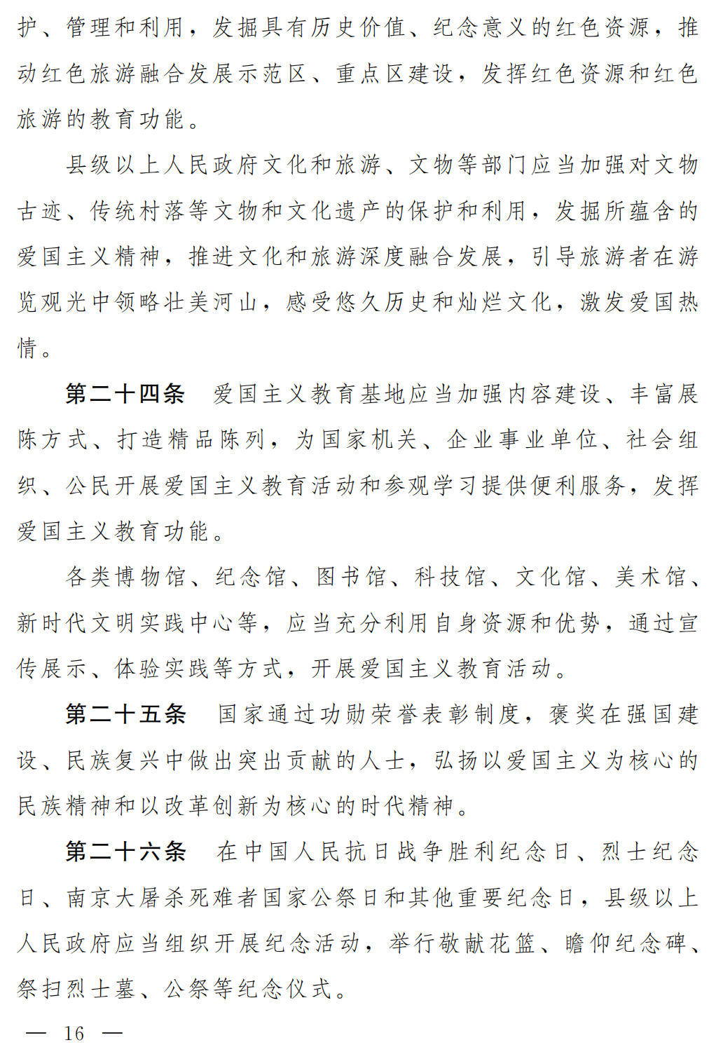《草案》提出,县级以上人民政府文化和旅游、文物等部门应当加强对文物古迹、传统村落等文物和文化遗产的保护和利用,发掘所蕴含的爱国主义精神,推进文化和旅游深度融合发展,引导旅游者在游览观光中领略壮美河山,感受悠久历史和灿烂文化,激发爱国热情。