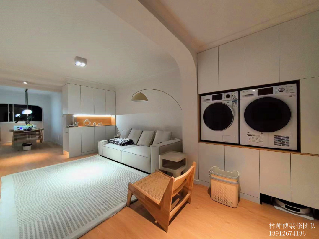 客厅和阳台打通,通铺地板,扩大视觉空间,使得整个空间非常的敞亮。而且,阳台柜和洗烘机都是内嵌设计,整洁美观。