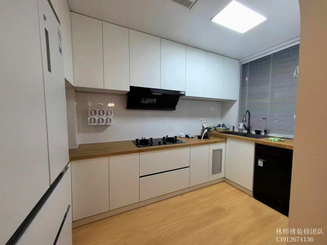厨房也是白色搭配原木色,清新自然。而且是U型的设计,让收纳能力最大化。厨房台面还做了高低台,更符合下厨动线,提高舒适度。