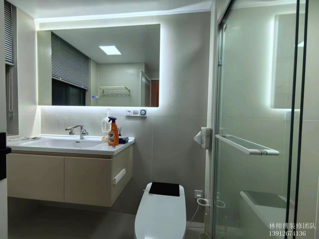 卫生间,浅灰色瓷砖、浅色洗手池、智能马桶、藏光……给人一种优雅文艺的视觉感。