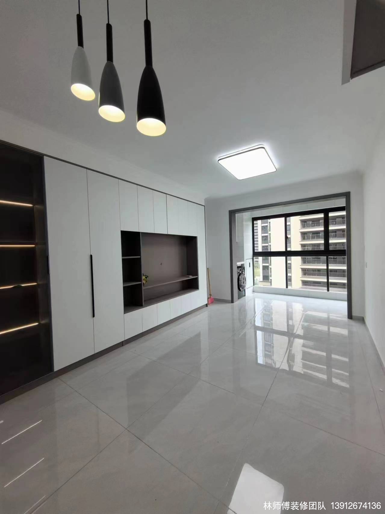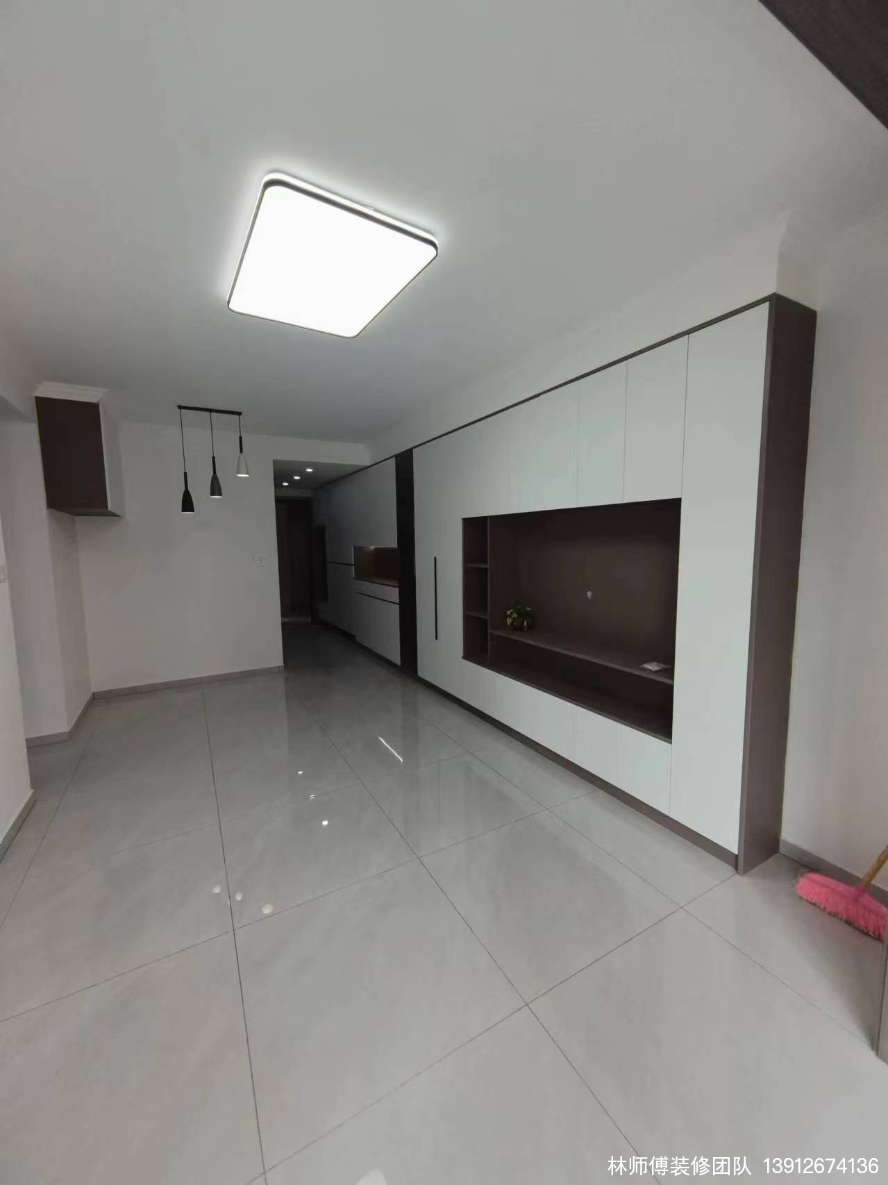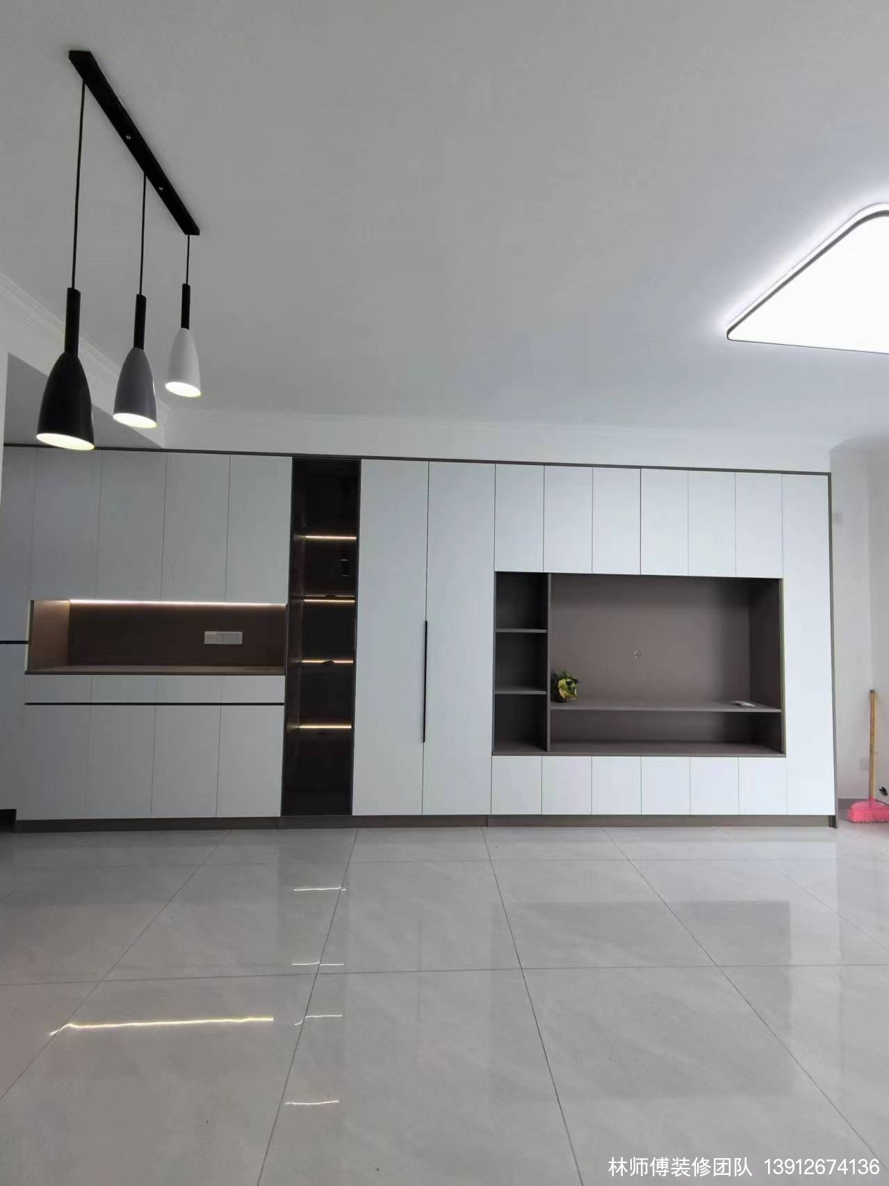 入户与客厅之间没有墙体,呈长条形分布,因此在设计时做了一字型玄关柜+电视柜,收纳能力超强,也是整个家庭收纳的“半壁江山”。