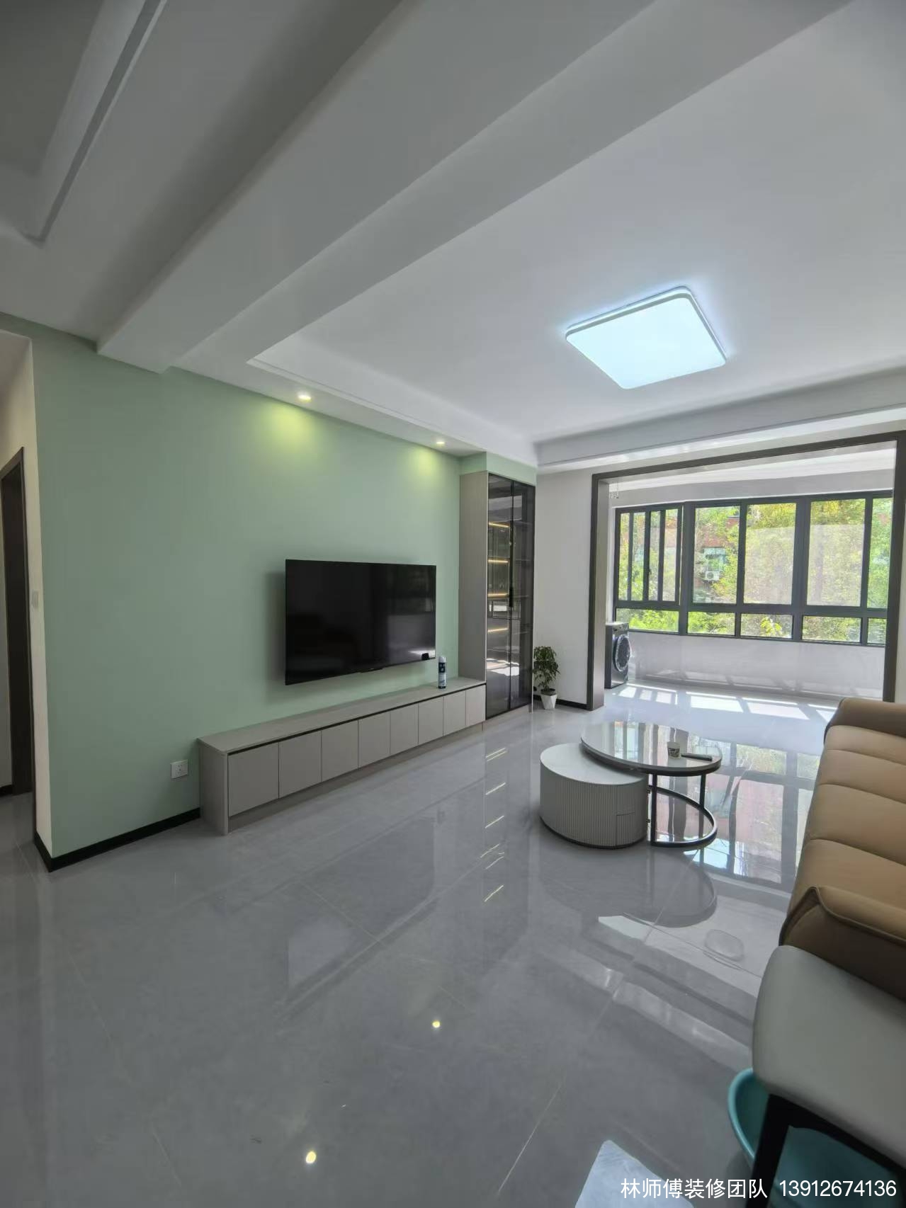 客厅的布置也是以简约为主,淡绿色的电视墙,清新自然,让整个空间充满生机。沙发选择了皮质的,不仅舒适还非常的大气。客厅里没有用笨重的大茶几,而是选用一个圆形的错层小茶几,不仅显得精致,也不占地方。电视柜是L型设计,收纳和展示都兼顾到了,完美!