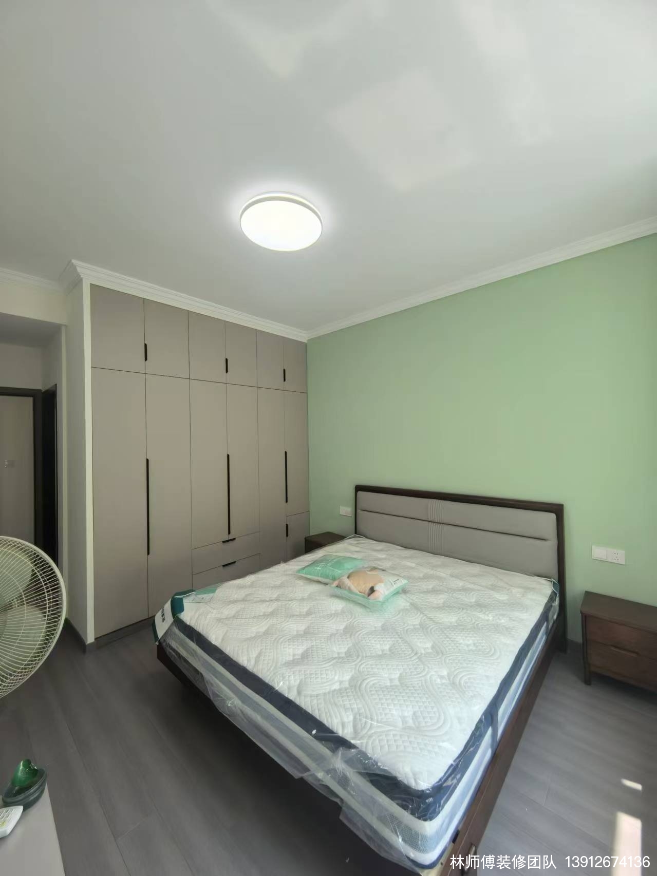 主卧的背景也刷成了淡绿色,这为整个卧室带去了自然舒适的感觉,好像一切烦躁都能在这一瞬间被抚平,让人放松。