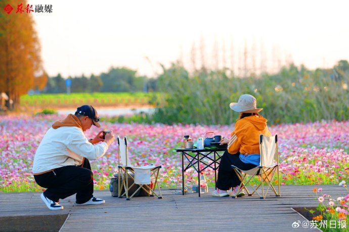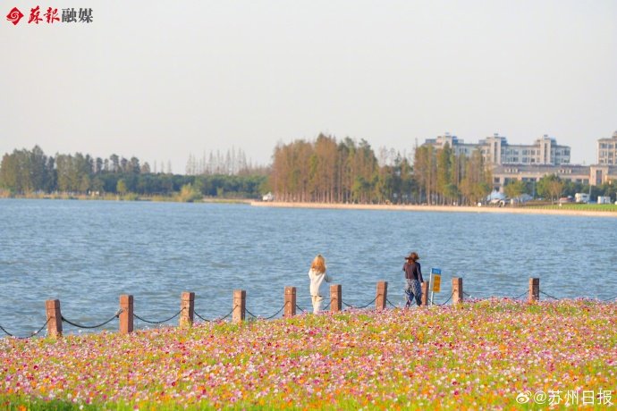 江苏苏州。昆山淀山湖环湖大道边,色彩斑斓的格桑花盛开,来此赏花的游客络绎不绝。