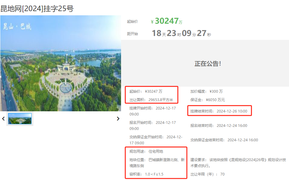 刚刚,昆山市国有建设用地使用权网上交易系统新挂出一宗住宅地块——昆地网[2024]挂字25号,地块位于巴城镇新澄路北侧、新境路东侧,2024年12月26日上午10点正式开拍,起拍楼面价6800元/㎡。