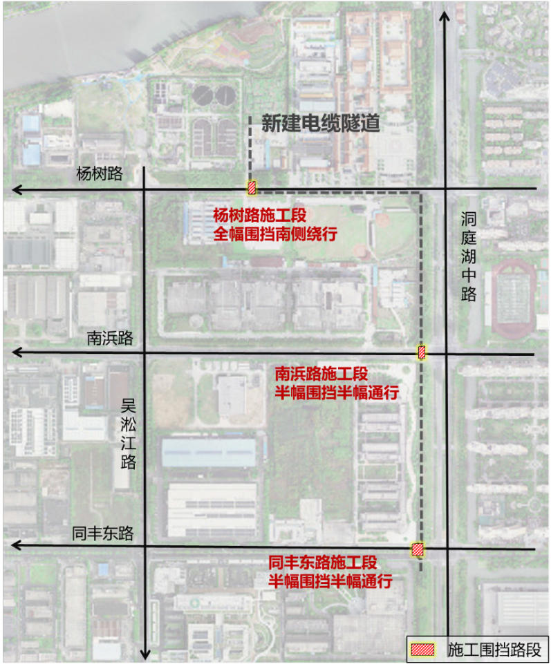 因电力工程建设需要,将对沿线杨树路、南浜路、同丰东路部分路段及路口进行占道施工。施工期间,沿线道路保证双向两车道正常通行,建议过往车辆及行人按照交通指示减速慢行。
