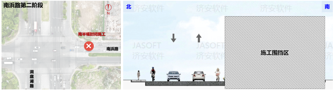 南浜路第一阶段北半幅封闭施工南半幅通车,第二阶段南半幅封闭施工北半幅通车。