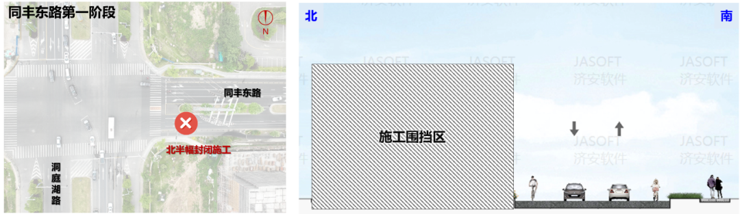 同丰东路第一阶段北半幅封闭施工南半幅通车,第二阶段南半幅封闭施工北半幅通车。
