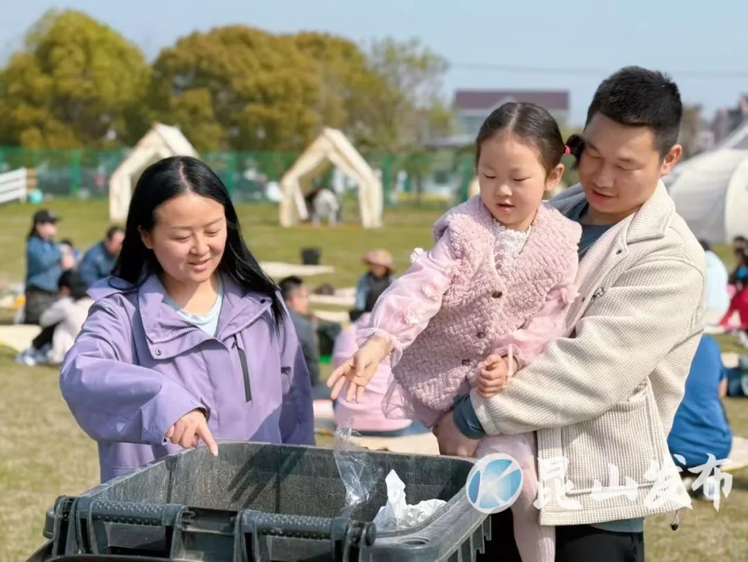 ▲周市镇露营点,家长引导孩子垃圾分类,将垃圾正确入桶